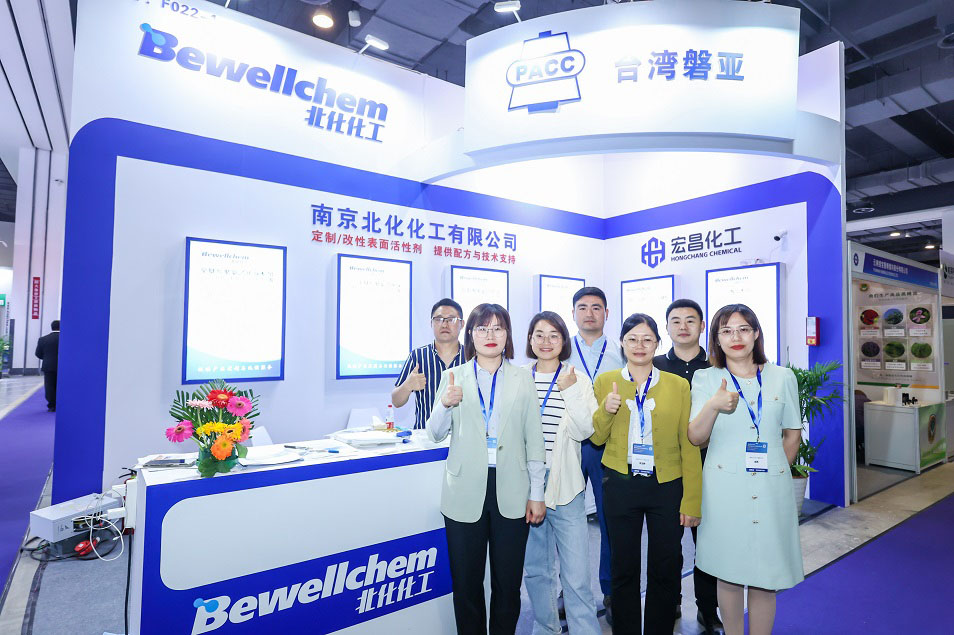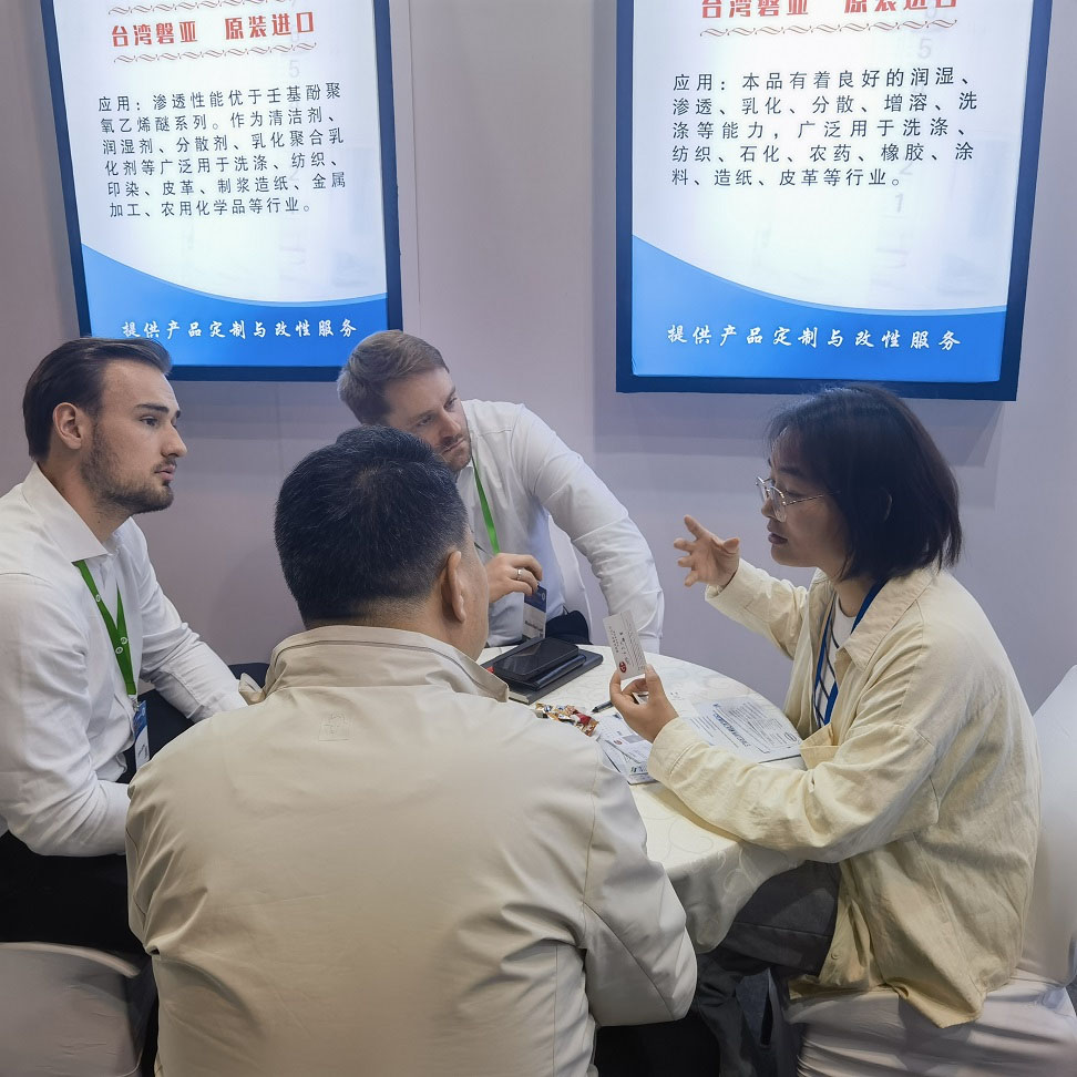 展会期间,我们与众多新老朋友共同探讨了表面活性剂产品在洗涤剂中的有效应用。针对工业洗涤剂,我们主要推荐了壬基酚聚氧乙烯醚(NPE系列)、脂肪醇聚氧乙烯醚(AEO系列)和壬基酚(NP)等产品的工业应用;针对家用洗涤剂,我们重点介绍了十二烷基醚硫酸钠(SLES)和直链烷基苯磺酸钠(LABSA)在洗衣粉和洗衣液中的有效应用。