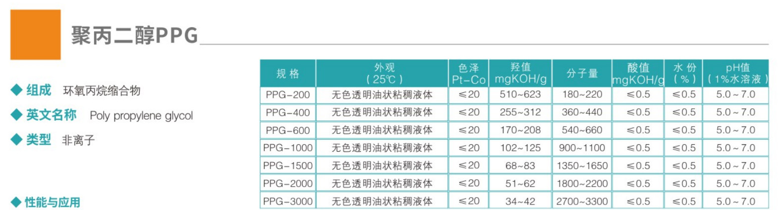 1、PPG系列物质可溶于甲苯、乙醇、三氯乙烯等有机溶剂中。PPG200,400,600则能溶于水中,并具有润滑、增溶、消泡和抗静电性能。PPD-200可作为颜料的分散剂使用。